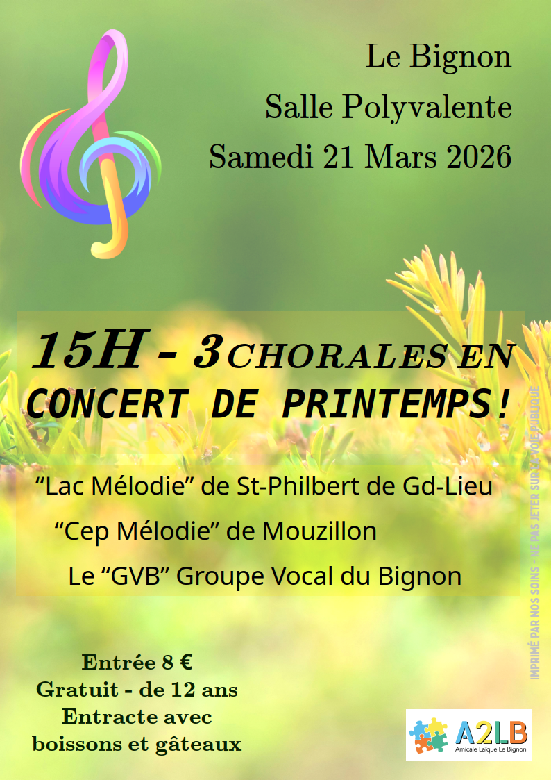 « Nous aurons la joie de partager la scène entre le Groupe Vocal du Bignon (GVB) avec son chef de choeur Stéphane KOFFI, « Cep Mélodie », de Mouzillon dirigé par Philippe JEAN ainsi que « Lac Mélodie », sous la direction de Bárbara ORELLANA. »
